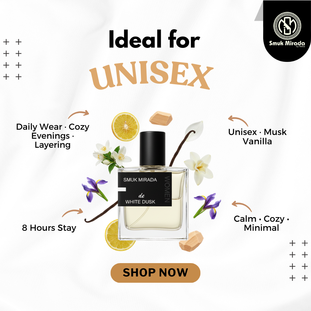 White Dusk Perfume by Smuk Mirada is a luxurious unisex fragrance that beautifully blends creamy vanilla with soft musk and white florals. Crafted to be both comforting and elegant, this musk vanilla perfume is ideal for everyday use, making it a staple for those who prefer subtle sophistication over loud statements.