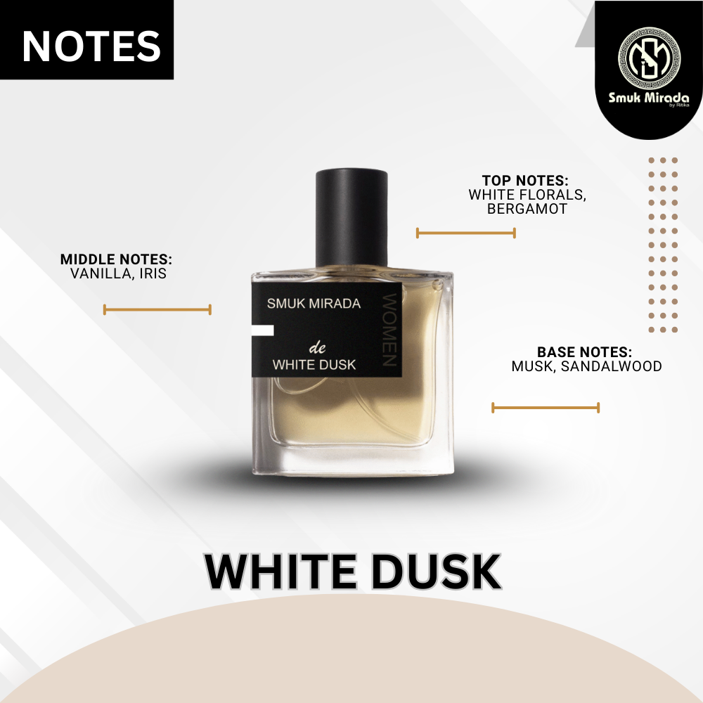 This unisex scent opens with a delicate freshness of white florals and bergamot that gradually melts into a heart of velvety vanilla and powdery iris. At its base, warm sandalwood and clean musk linger gently, creating a skin-hugging trail that feels both cozy and sensual. Whether you’re heading to the office, curling up with a book, or enjoying a slow evening, White Dusk Perfume offers the perfect olfactory companion.